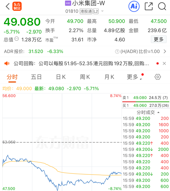 受该事件影响,小米集团-W股价今日大幅下跌,盘中一度跌超8%。截至当日收盘,小米集团-W收跌5.71%,报49.08港元/股。
