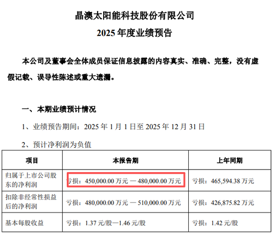 继2024年巨亏之后,光伏龙头晶澳科技2025年继续巨亏。